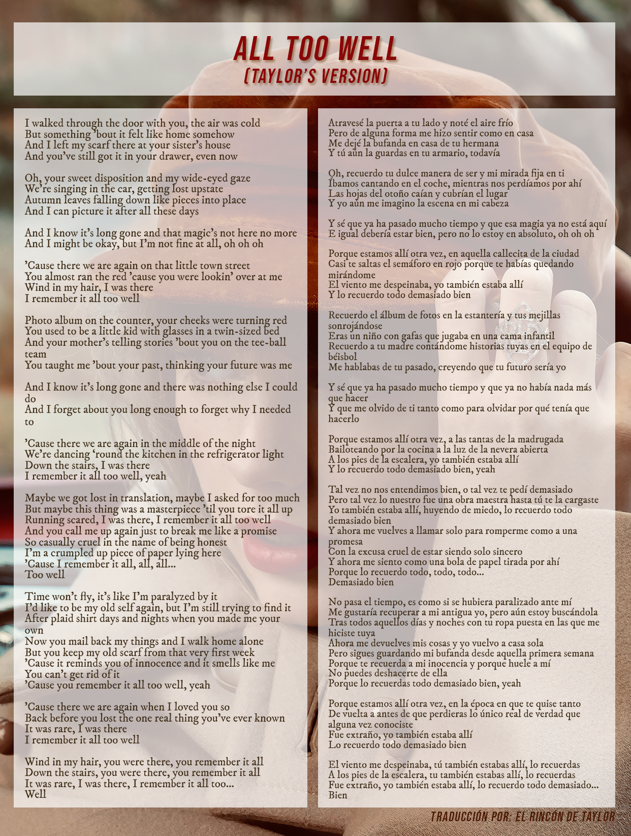 - Curiosidad: Ésta fue la primera canción que Taylor escribió de este álbum y la que más le costó; Liz Rose, co-autora, dijo que la versión original de All Too Well duraba, de hecho, 10 o 12 minutos, pero que se tuvo que acortar para dejar solo las partes más importantes. Además, Taylor temía, nada más lejos de la realidad, que no gustara a sus fans por lo personal que era. (Actualización: ahora, nueve años después, tenemos dicha versión extendida y no nos puede gustar más.)