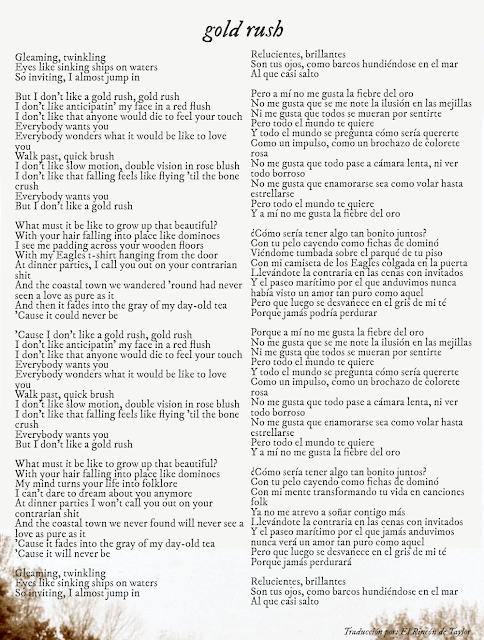 pienso que está canción es para Harry Styles, en su vídeo de satellite hace referencia a dos calles que se llaman "gold rush" y "Eagle Drive" , en la letra de gold rush dice " me veo caminando por tus piso de madera con mi camiseta puesta de "Los Eagles " . Otra referencia es la canción "Slut" que Taylor acaba de lanzar en 1989 from the vault.la letra dice "Todos lo quieren a él ese fue mi crimen" ,en la letra de gold rush dice"Todos te quieren, todos se preguntan cómo se siente amarte ", también habla de "Sinking Ships" barcos hundidos ,Taylor swift acompañó a Harry a tatuarse su famoso tatuaje de barco que lo tiene en todo el brazo.
